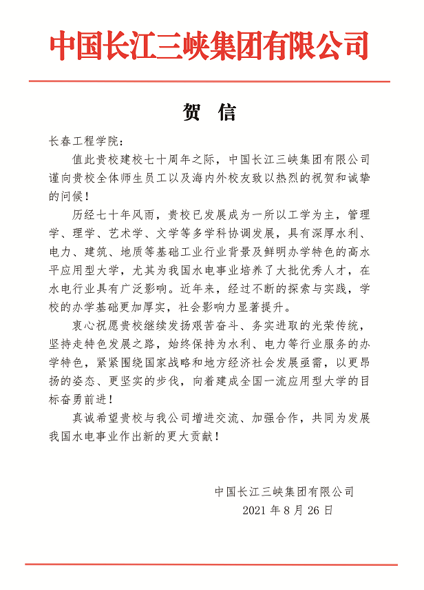 中国长江三峡集团致信祝贺乐鱼官网网页版_乐鱼(中国)官方建校70周年