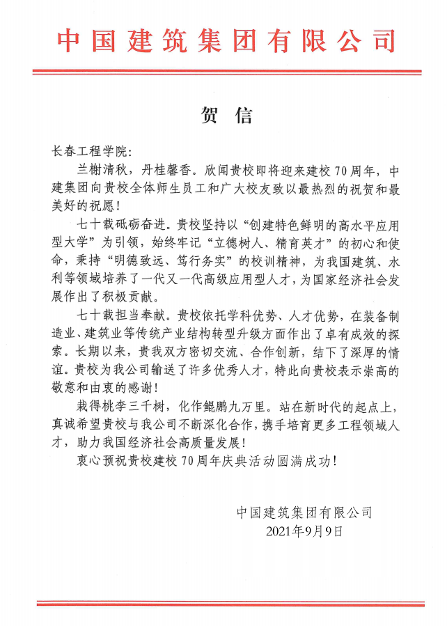 2021年9月10日,乐鱼官网网页版_乐鱼(中国)官方收到中国建筑集团有限公司发来的贺信,在即将迎来建校70周年之际,向乐鱼官网网页版_乐鱼(中国)官方全体师生员工和广大校友致以最热烈的祝贺和最美好的祝愿!贺信全文如下: