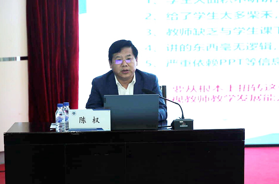 陈权校长简要介绍我国现阶段高等教育现状后,阐述了教师的自身定位、教师标准及发展路径。我国现阶段高等教育已经从“规模发展”阶段发展到“质量提升”阶段,大学乃至社会对教师“能教”以及“会教”的诉求越来越强烈,对教师教学水平的提升也越来越迫切。陈权强调,要成为一名优秀的长工程教师,首先,要明晰自身定位,教育教学活动是生命与生命的交往,作为老师应该了解面对什么样的学生,了解他们的关注点、兴奋点,才能成为学生喜欢的教师;作为大学教师,还需具有把职业理念内化为教学本领和教学能力,作为长工程教师也需要清晰的把握我校办学历史、办学使命、办学理念、办学定位、办学目标、培养规格。只有这样,大家才能做到自身职业发展与乐鱼官网网页版_乐鱼(中国)官方的发展同向同行、同频共振。
