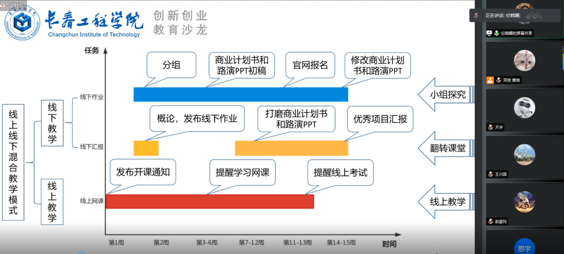 纪晓娜老师作为本次沙龙的主讲嘉宾,从建设课程角度提出利用线上平台资源,构建双创课堂,采用线上讲授,线下布置任务,线上阶段性评价的教学模式。老师对各小组项目进行阶段性指导,通过小组互评形式评选出优秀项目进行深度打造。