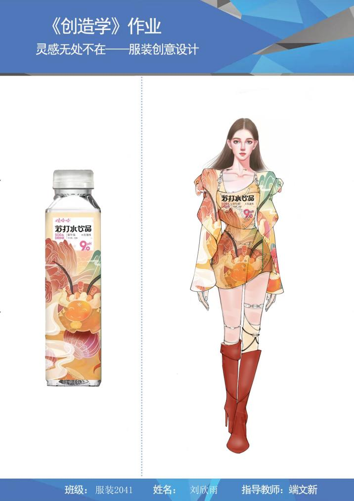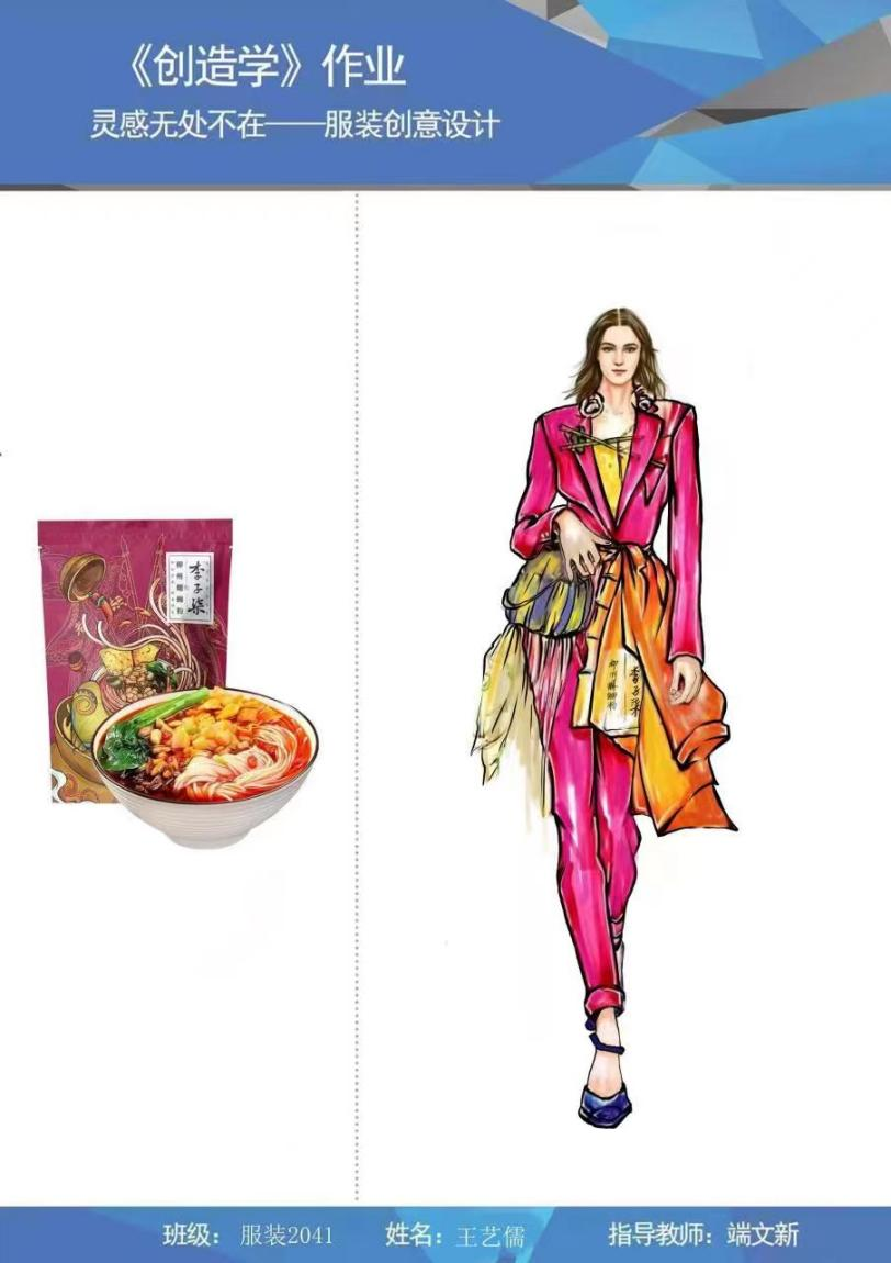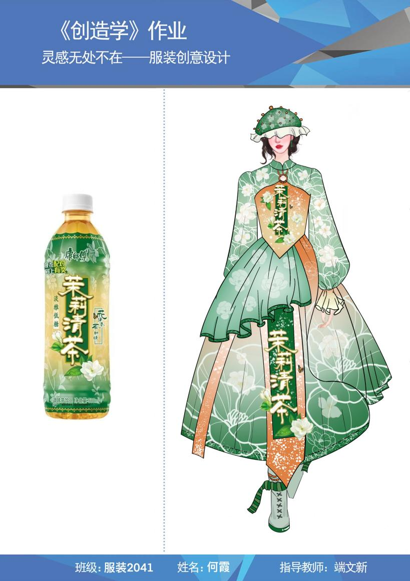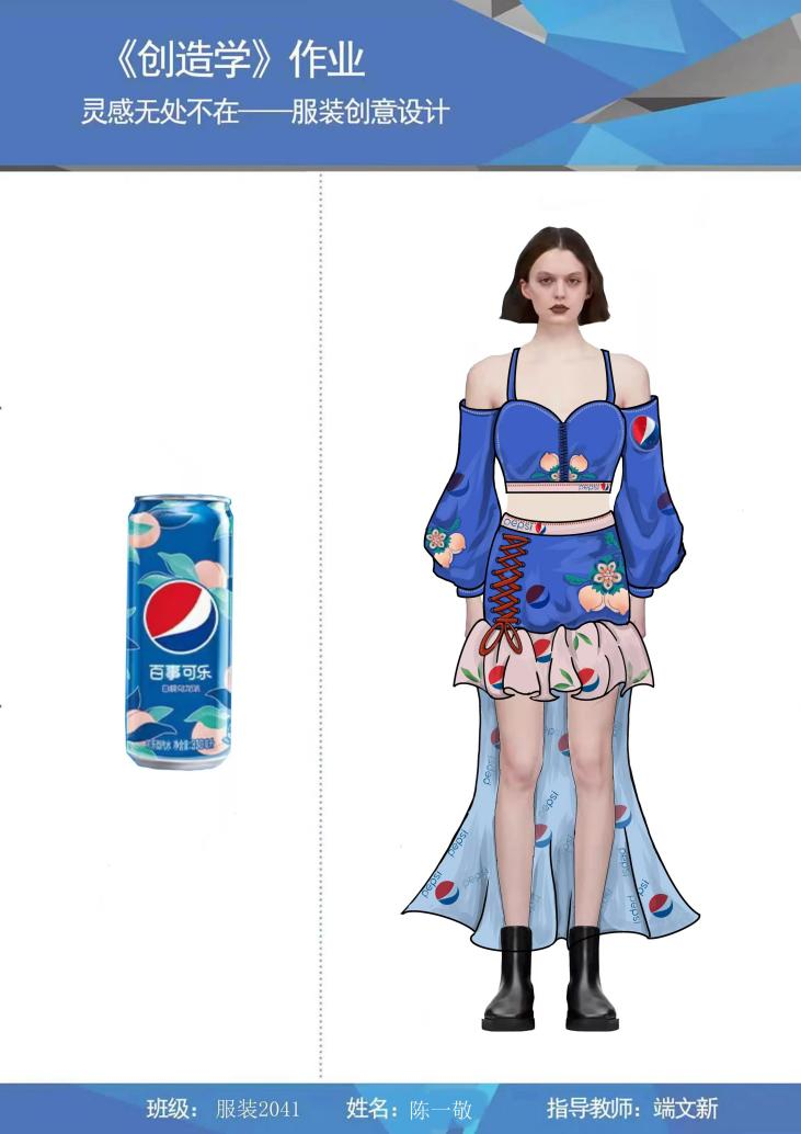 在服装与服饰专业2020级《创造学》的课堂上,任课教师端文新布置了题为“灵感无处不在”的课后作业,作业内容充分考虑到学生寝室封闭管理的实际情况,他鼓励学生以各种饮料包装瓶子为灵感来源,提取设计元素,创作服装设计,取得很好的效果。既有效进行了教学总结和课后巩固,又有效培育了学生们的创造性思维,在疫情封控艰苦的学习条件下,营造“可感、可学”的氛围,悉心培育艺术学子们的“艺术之花”,而学子们的艺术情操得到陶冶,艺术巧思也跃然纸上。