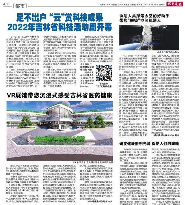 我校许骏教授团队研发的科技成果“吉林省医药健康产业大数据可视化智能分析展示与推广VR平台”一经展示,便吸引众多市民体验。该成果提供了沉浸式漫游游览和丰富的交互功能,直观展示了吉林省医药健康产业的发展,宣传推广吉林省医药健康产业知名企业和明星产品。《城市晚报》以《VR展馆带您沉浸式感受吉林医药健康》为题报道了此项科技成果。