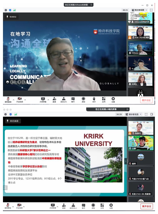 柬埔寨专业大学英语学院院长Chhorn Than博士、马来西亚理科大学中国中心负责人Kenneth Quah先生、新加坡特许科技学院高级讲师Siow Chih Wee先生、泰国格乐大乐鱼官网网页版_乐鱼(中国)官方长助理赵楠博士等四位老师,分别以“Introduction of CUS and Cambodia—来自文明古国柬埔寨”“马来西亚多元素文化与马来西亚理科大学介绍”“新加坡人文地理风貌及新加坡高校校园文化”“泰友好、泰享受之泰国文化及留学”为主题,以视频、讲解等多样的方式,面向全校学生介绍东盟国家及城市的地理、风俗、文化,展示了柬埔寨专业大学、马来西亚理科大学、新加坡特许科技学院、泰国格乐大学的魅力和故事,实现了“云访问、云介绍”,使同学们领略了独具特色的东南亚各国风情,增进了对东盟国家大学文化的了解。近700名学生线上参加了此次活动。