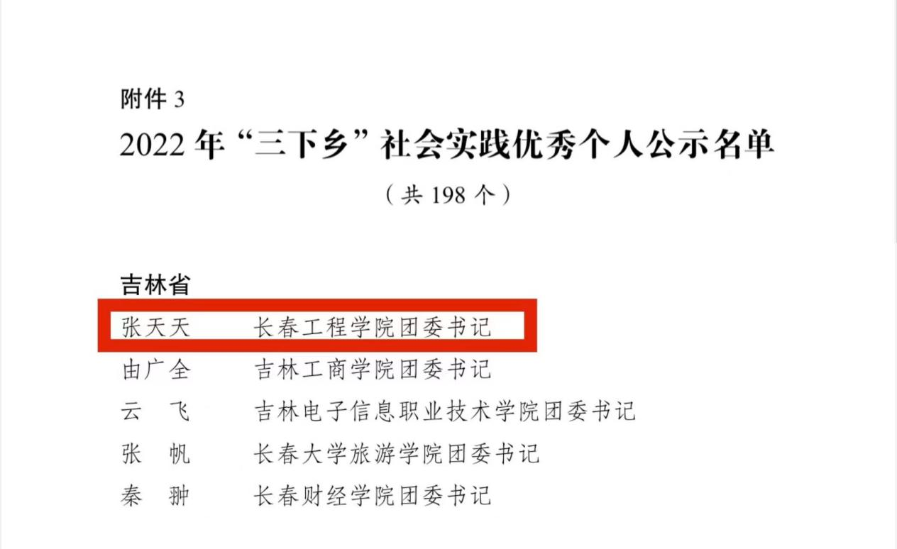 经基层申报、省级团委审核推荐、组织评议等环节,我校团委书记张天天被评为全国“三下乡”社会实践优秀个人(吉林省共5名)。