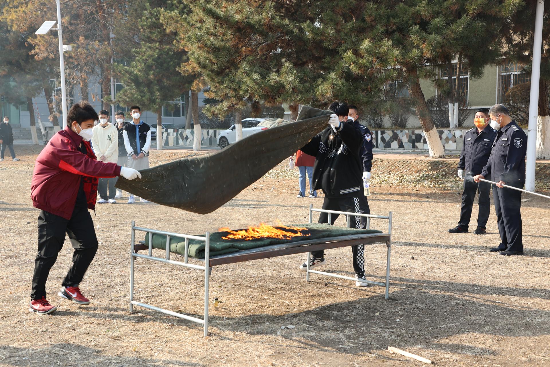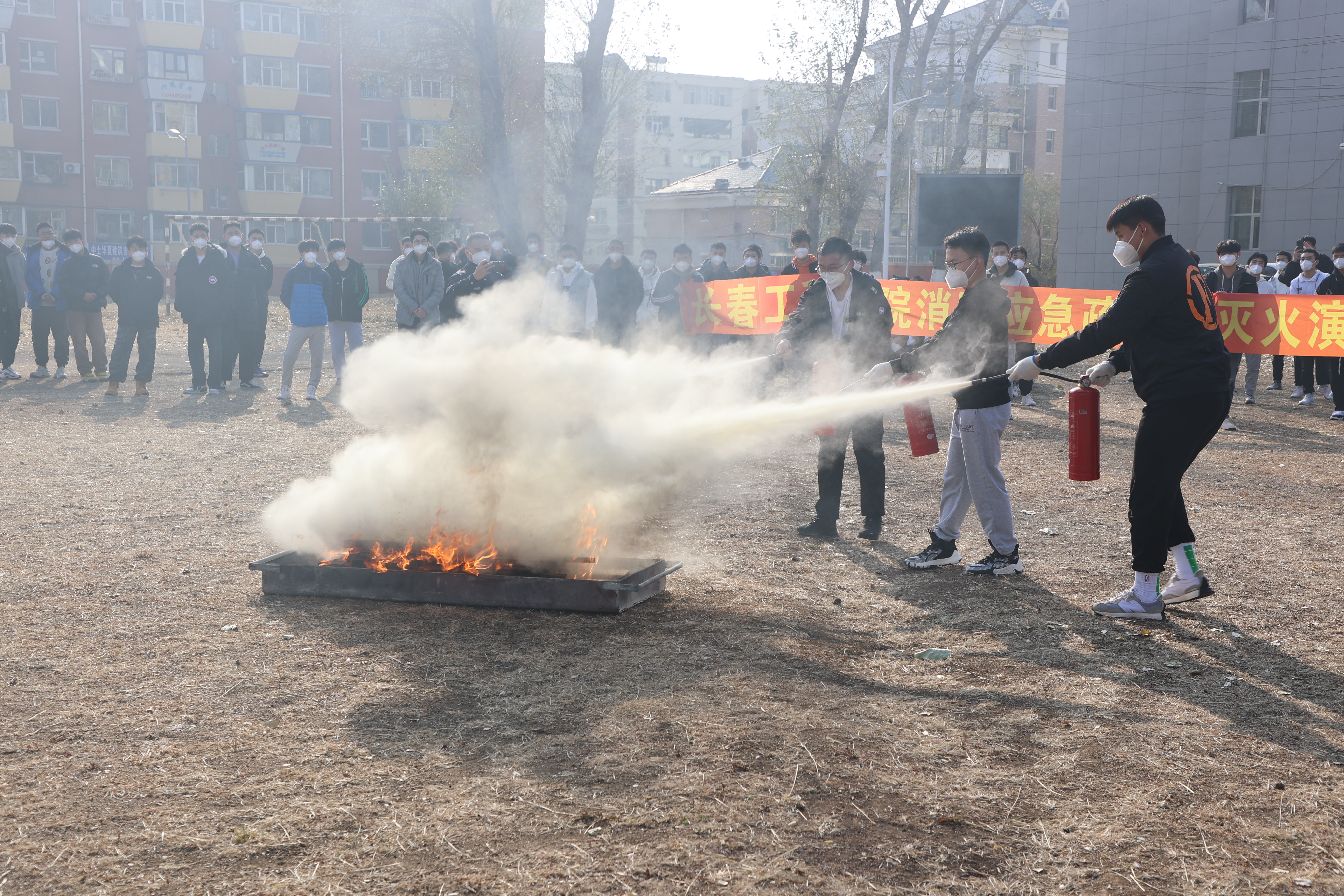 “消防日”下午,保卫处联合机电工程学院在湖西校区足球场开展了消防灭火应急演练,保卫处老师现场讲解了火场逃生、扑救初期火灾及灭火器的使用方法,指导学生现场使用灭火器灭火及床铺着火扑救演练。