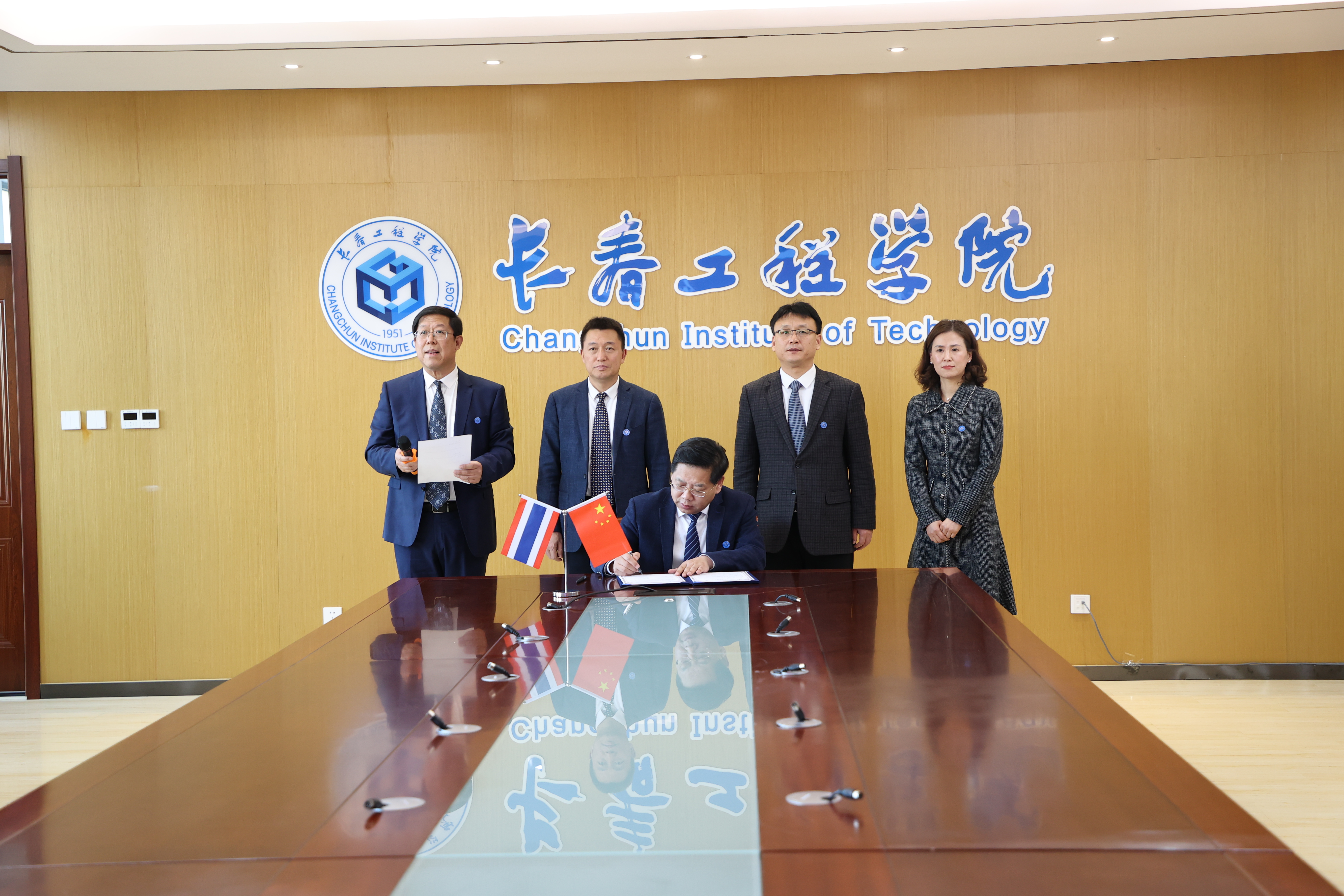 我校校长陈权,副校长王朝勇、张邦成,泰国格乐大学校长杨金泉,泰国格乐大学访学交流办公室主任都明明、副主任罗成,泰国格乐大学中国东北区主任贾海滨和长春·哈尔滨国际事务中心主任李贺飞共同出席了签约仪式。签约仪式由我校国际合作与交流处处长赵玉玺主持。