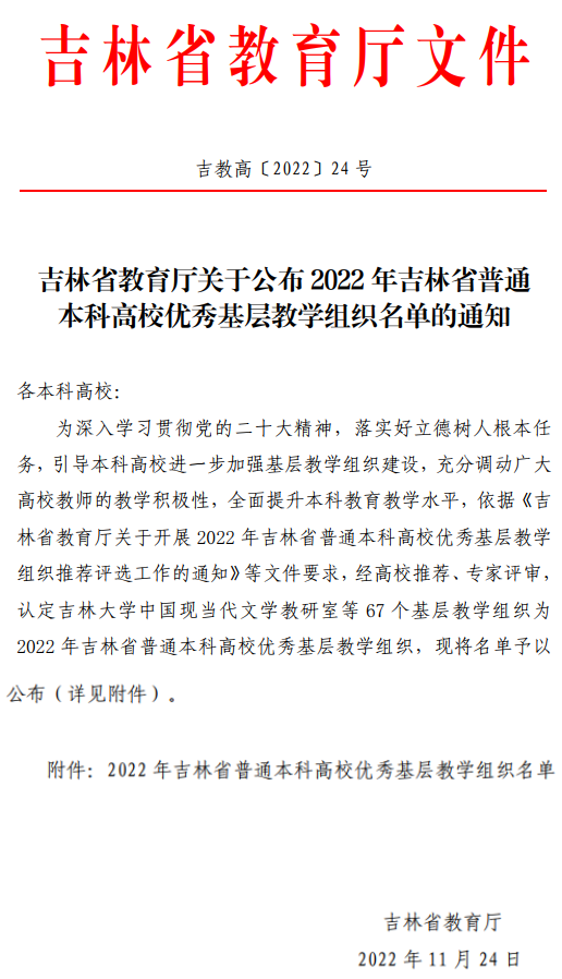 我校获批1个2022年吉林省普通本科高校优秀基层教学组织(A类)