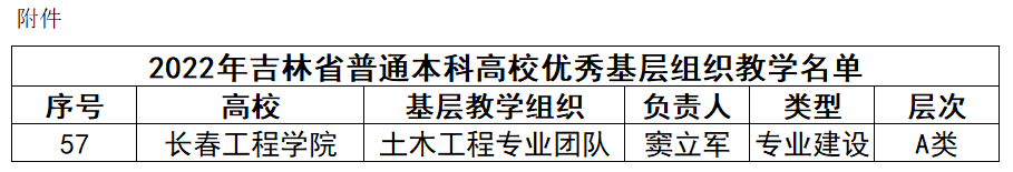 近日,吉林省教育厅发布了《吉林省教育厅乐鱼官网网页版_乐鱼(中国)官方公布2022年吉林省普通本科高校优秀基层教学组织名单的通知》(吉教高〔2022〕24号),我校土木工程专业团队成功获批2022年吉林省普通本科高校优秀基层教学组织(A类)。