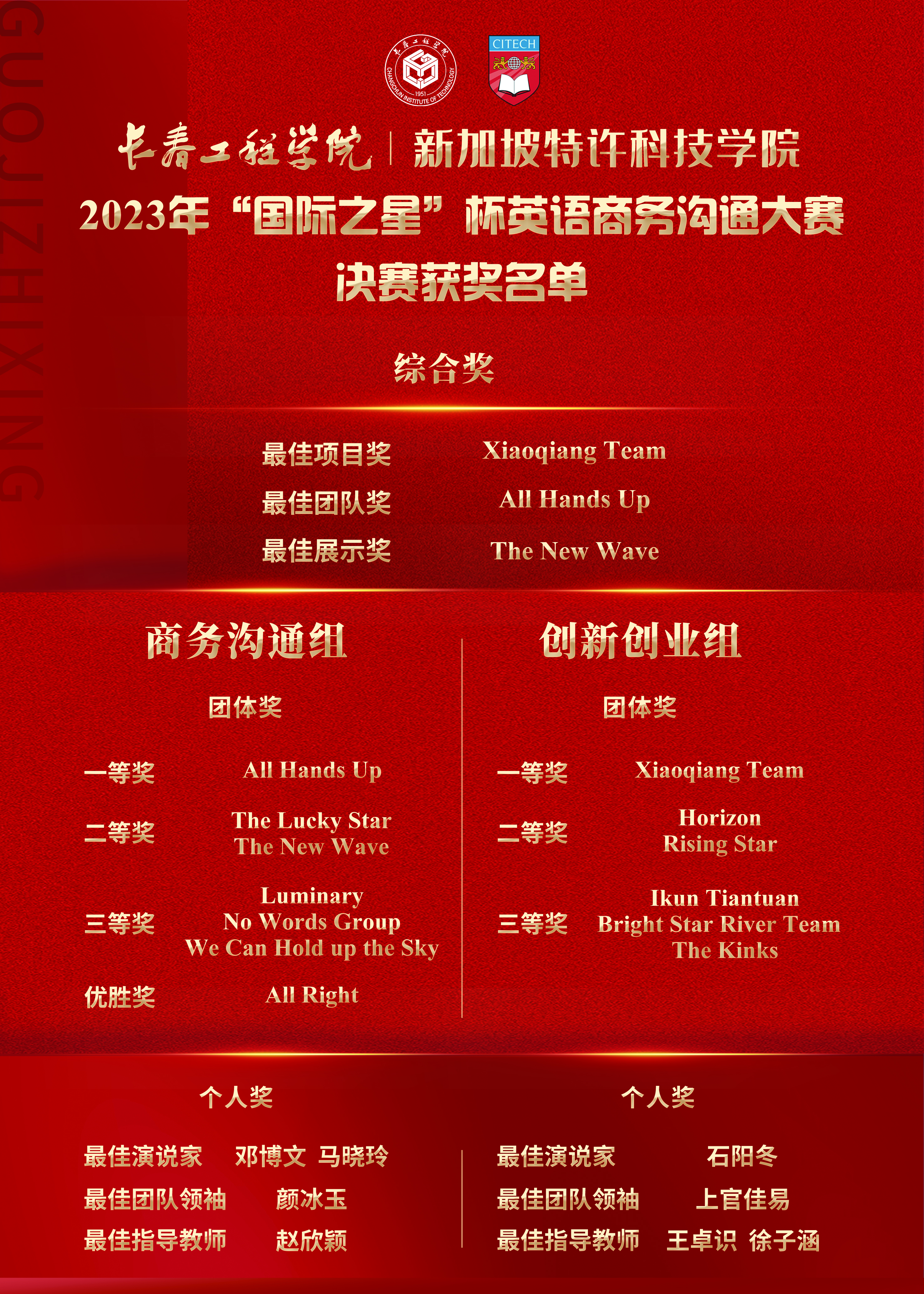 经过激烈角逐,最终All Hands Up队获得商务沟通组一等奖,Xiaoqiang Team获得创新创业组一等奖;邓博文、马晓玲、石阳冬等同学获得“最佳演说家”等个人奖项。