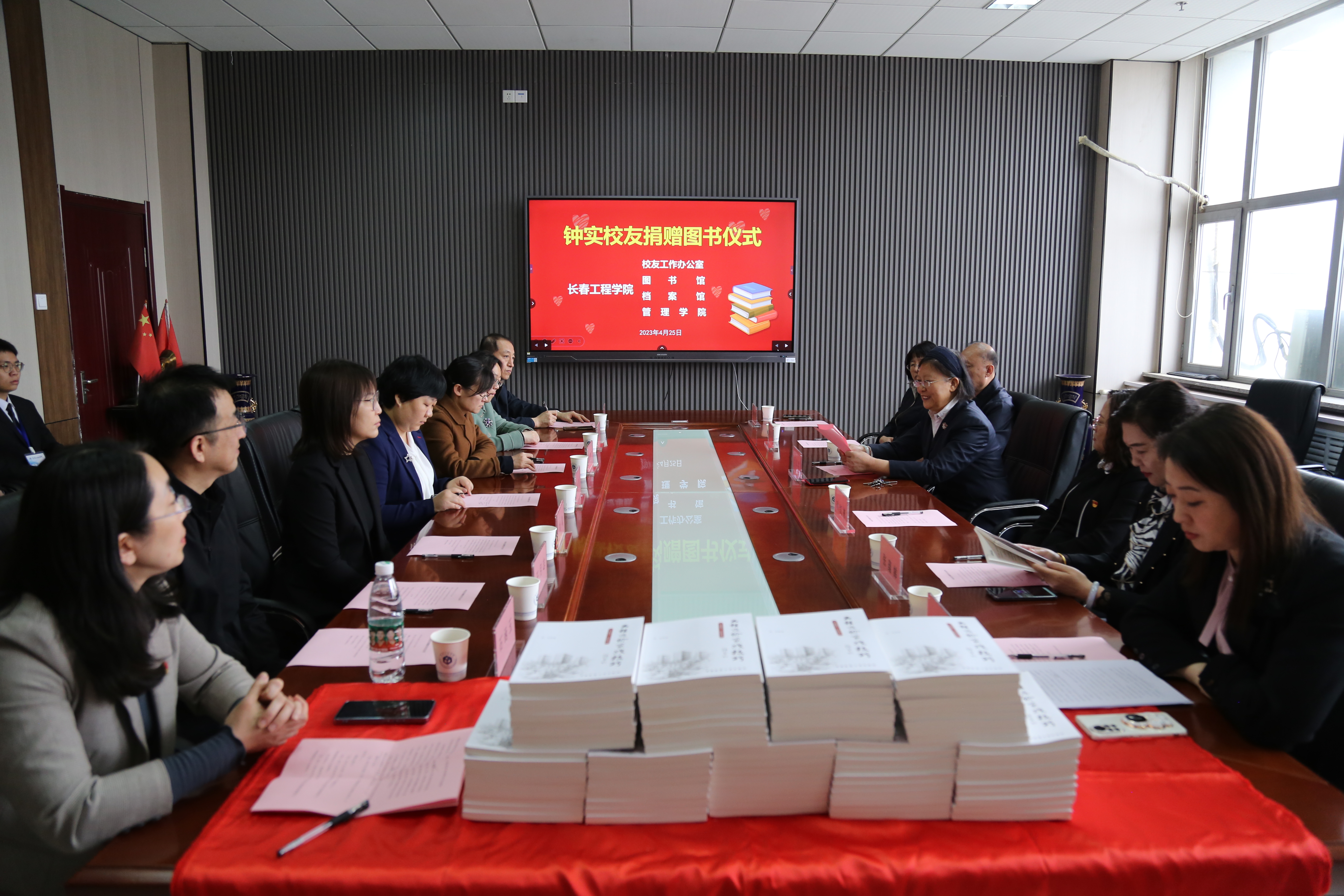 于立君老师代表钟实校友分别向图书馆、档案馆和管理学院捐赠图书,校友工作办公室主任时红梅向钟实校友颁发了捐赠证书,于立君老师代为接收。