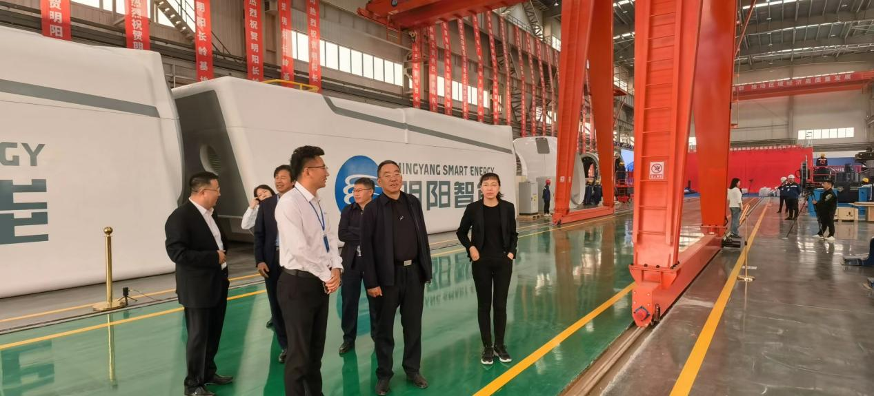 调研期间,能源动力工程学院一行还受邀参加了明阳智能长岭基地首台MySE6.25MW风电机组下线仪式,并参观了明阳智能长岭风电装备制造产业基地总装厂房和6.5MW风电机组生产流程。
