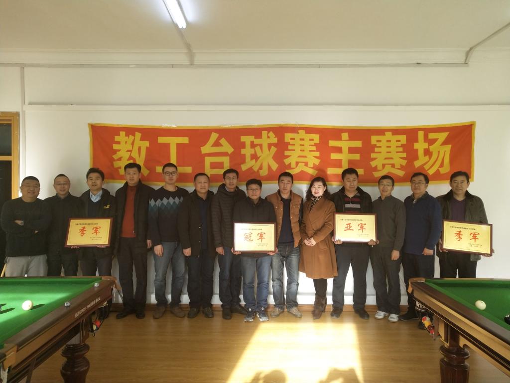为了更好的丰富教职工的日常文化生活,推动我校全民健身运动的深入开展,由校工会主办、教工台球协会承办的第四届教工台球赛圆满结束。经激烈角逐,能源动力工程学院代表队获得冠军,设计研究院代表队获得亚军,机关一队和电气与信息工程学院分获季军。