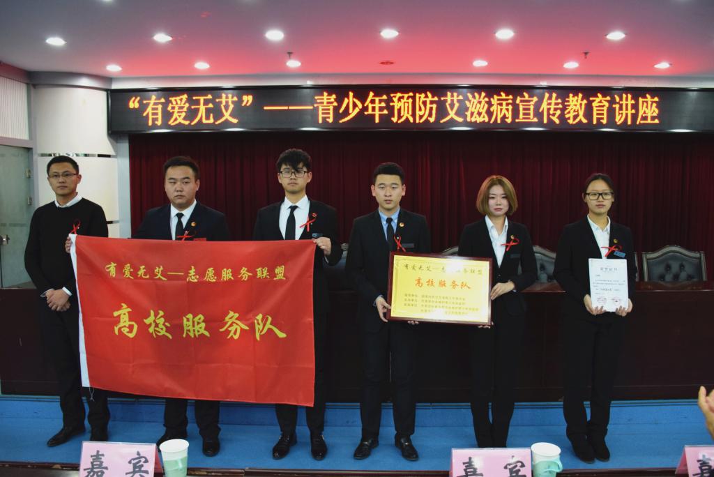 活动伊始,长春市益创汇社会工作服务中心理事长蒋鹏为我校授“有爱无艾”——高校服务队队旗队牌以及荣誉证书,标志着我校正式加入“有爱无艾”——高校服务志愿联盟。