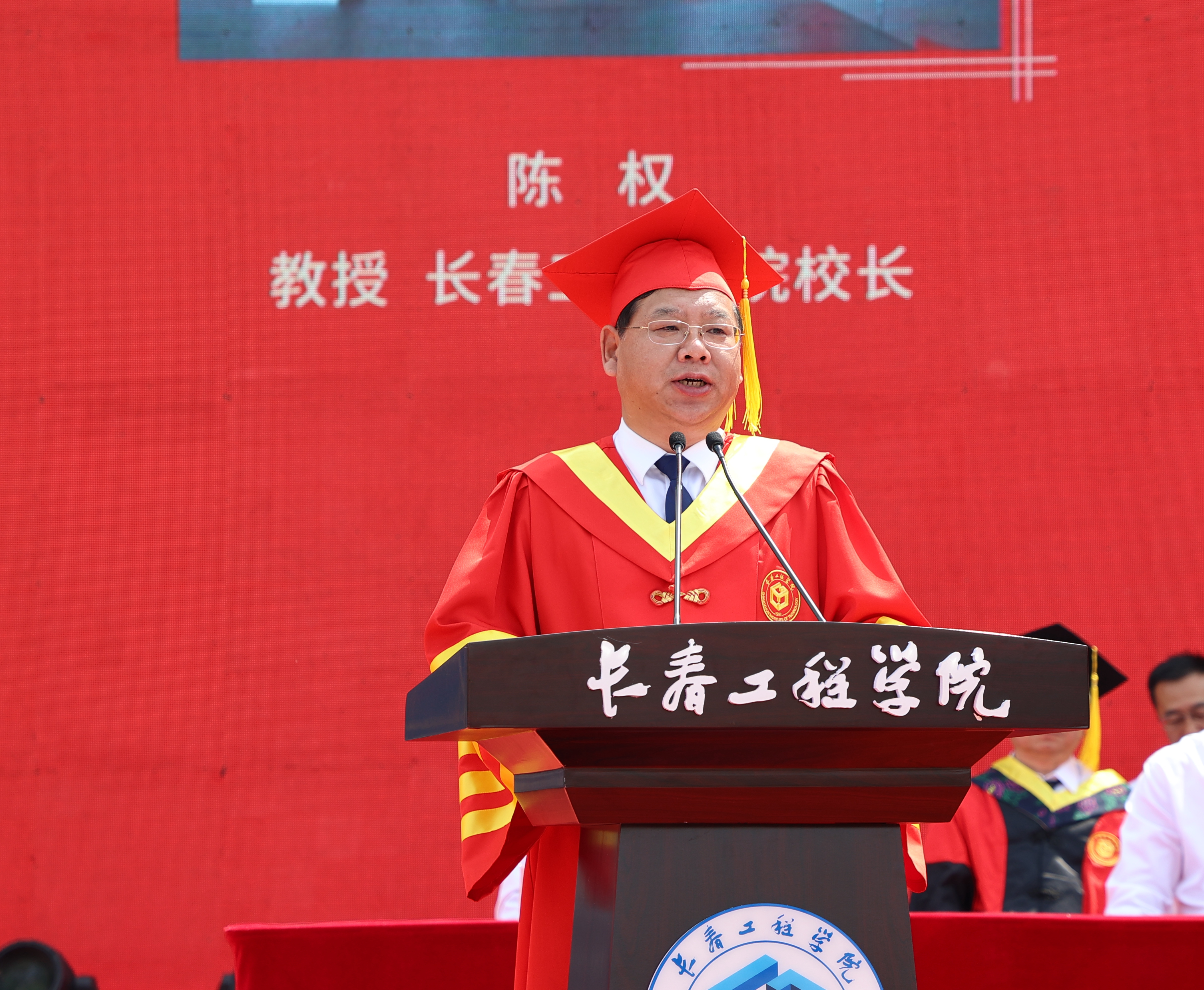 校长、校学位评定委员会主席陈权在典礼上讲话。他首先代表乐鱼官网网页版_乐鱼(中国)官方领导班子全体成员和全校教职工向毕业生们表示祝贺。