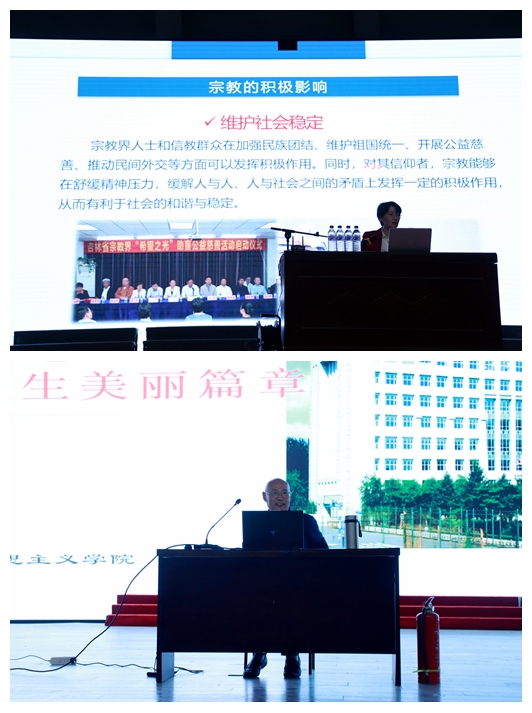 马克思主义学院副院长张晶和马克思主义学院教师高胜民为同学们进行理想信念教育,并对我国民族宗教政策进行了解读。两位老师对新同学们进入大学后如何找到新的理想目标、实现人生价值等进行了引导和教育。