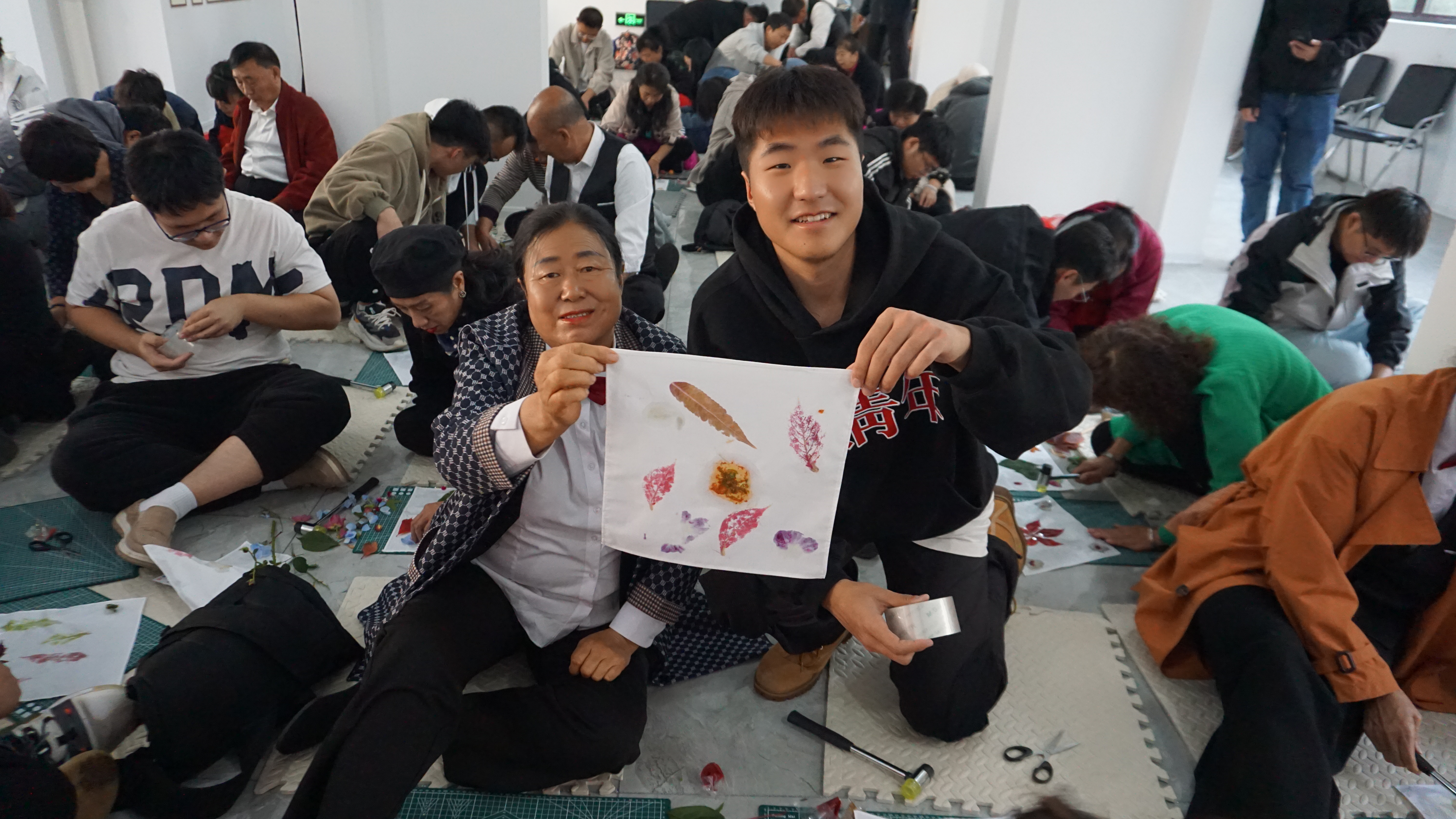 活动开始前,同学们为社区的居民介绍了中国非物质文化遗产植物拓染技术的发展历程,详细讲解了植物拓染技术之一——植物敲拓染的基本原理、应用场景和注意事项,并演示了植物敲拓染的制作步骤。随后,同学们协助参加活动的老人们制作植物敲拓染作品。大家发挥想象,自由创作,尽情体验植物拓染的乐趣。