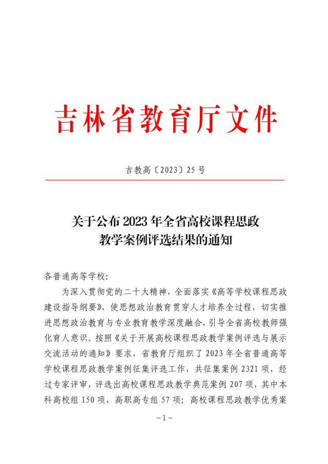 近日,吉林省教育厅印发了《乐鱼官网网页版_乐鱼(中国)官方公布2023年全省高校课程思政教学案例评选结果的通知》(吉教高〔2023〕25 号),我校4个案例入选高校课程思政教学典范案例,14个案例入选高校课程思政教学优秀案例。