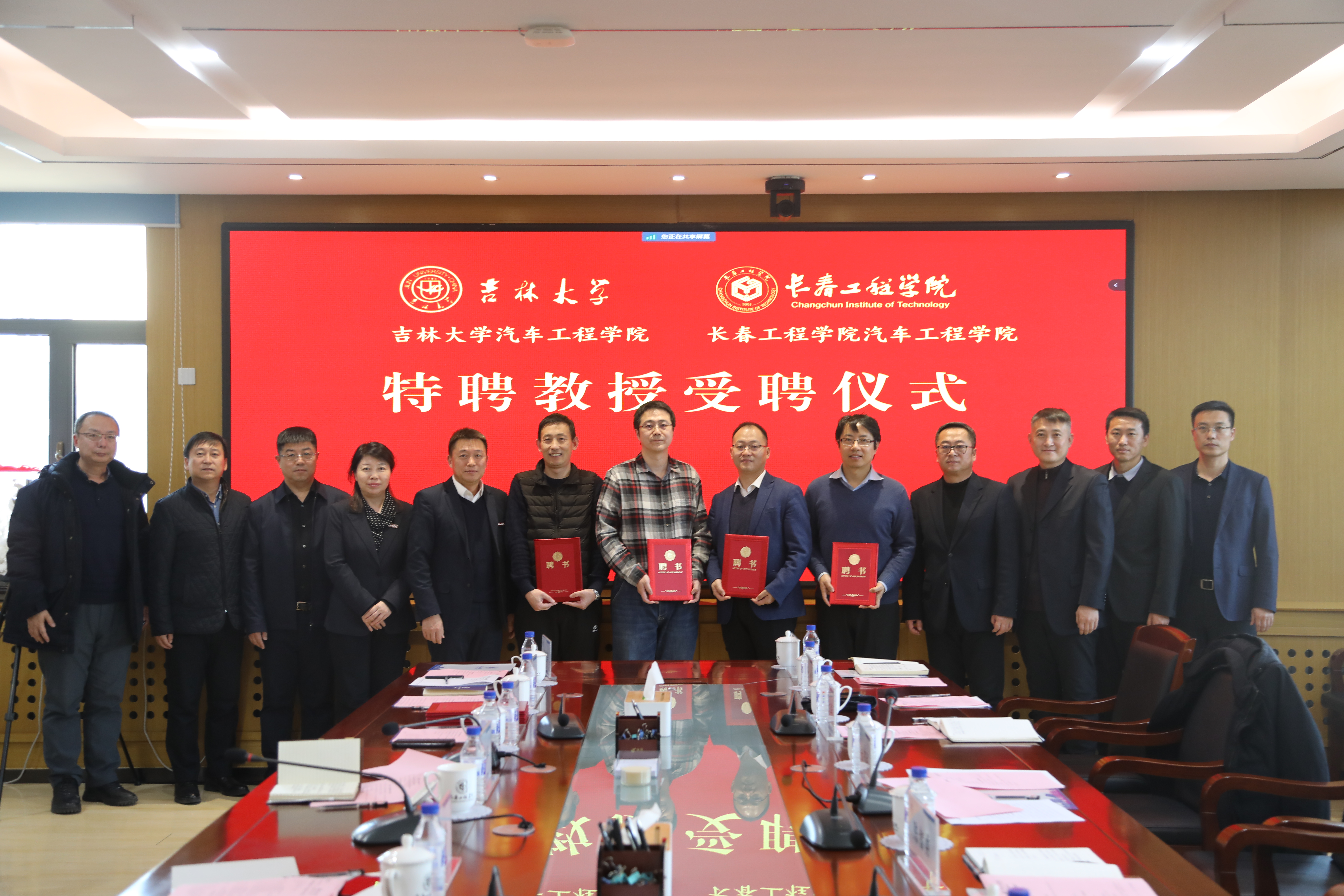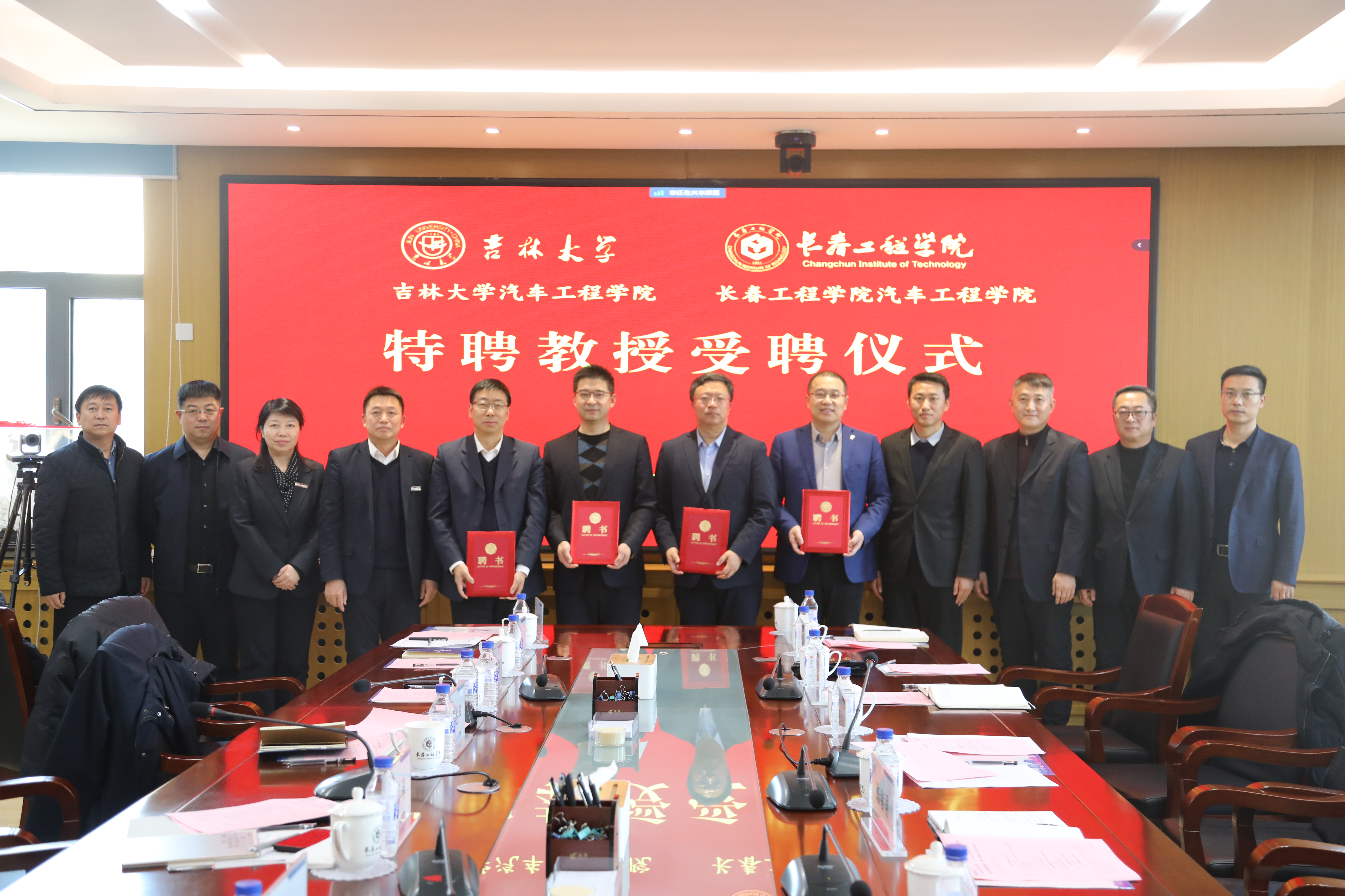 仪式上,张邦成副校长为来自吉林大学汽车工程学院、一汽解放公司的八位教授颁发特聘教授证书。