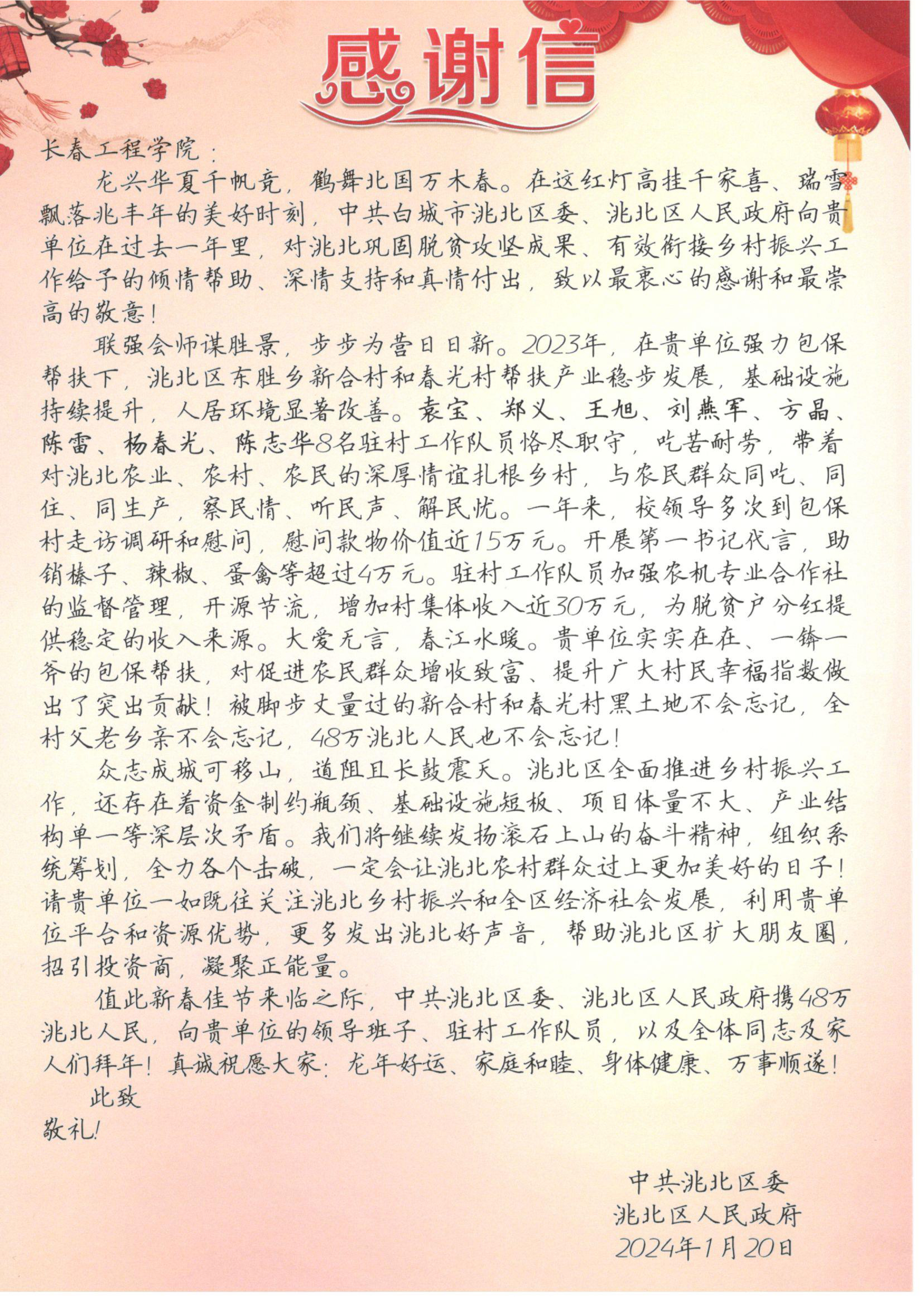 洮北区人民政府发来感谢信