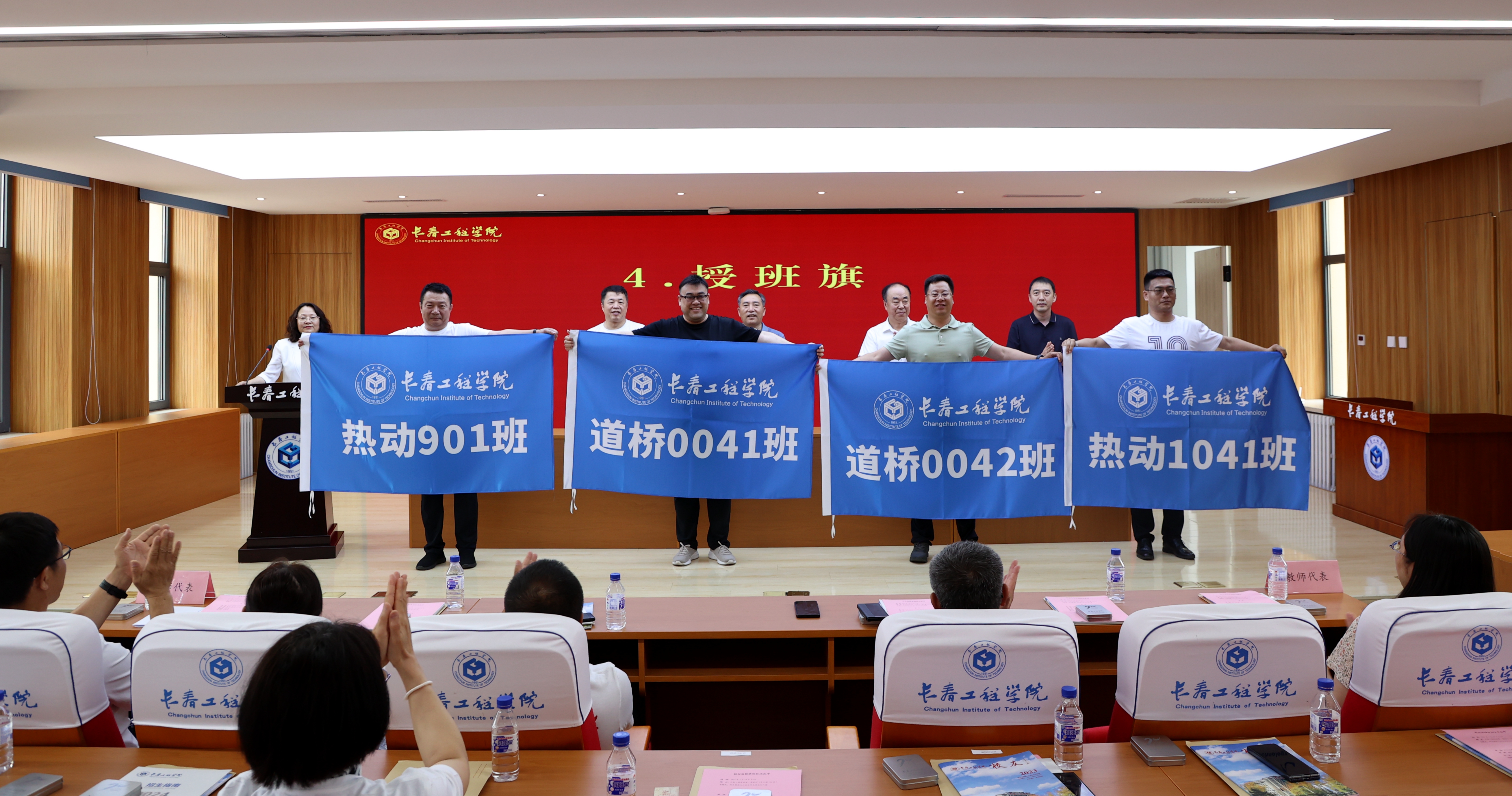 在欢迎仪式上,与会的各位领导为各班级校友代表授予了班旗。