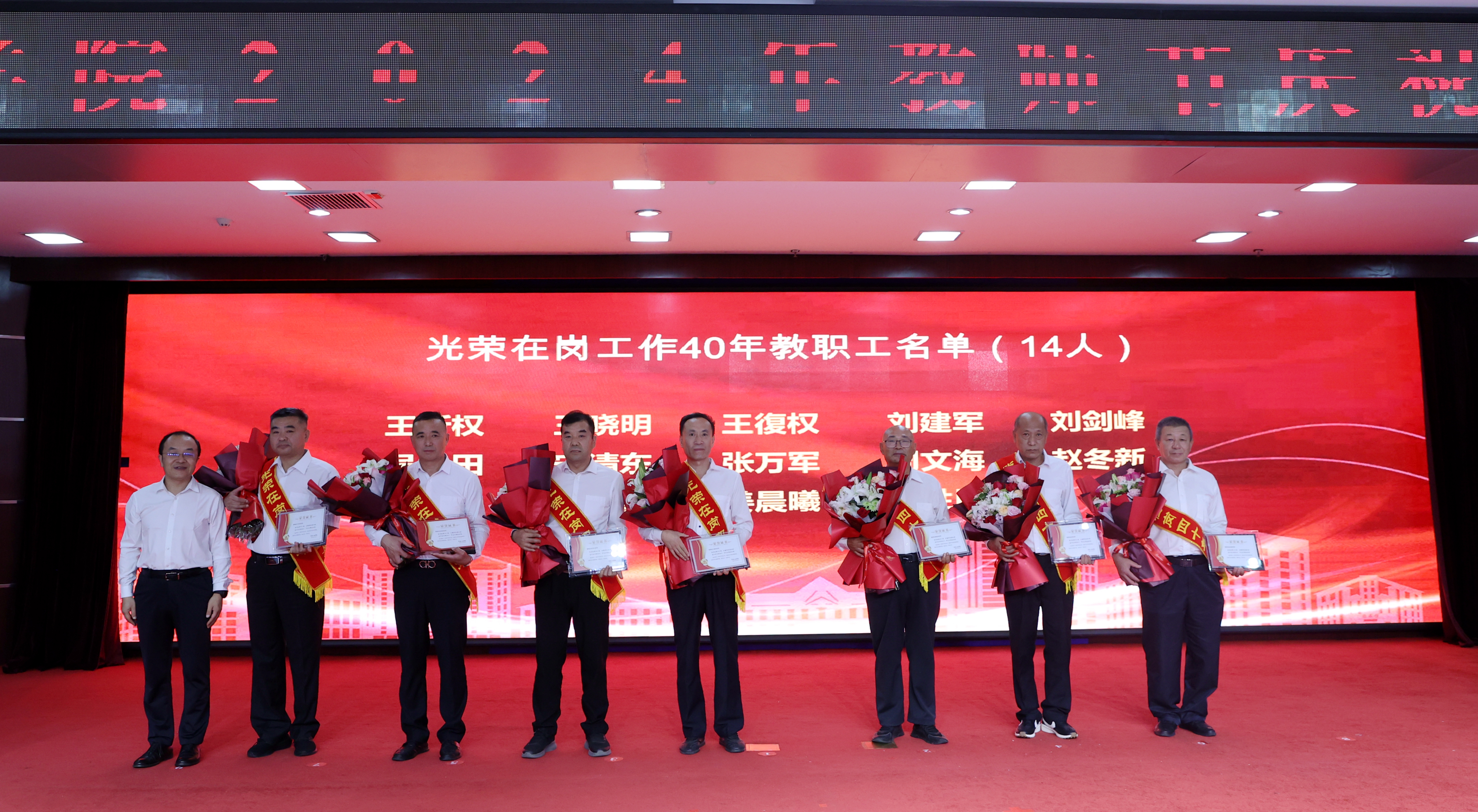 青蓝相继,薪火相传。会上举行了新教师入职仪式,退休教师代表王伯达、王长春、刘丽华、贾迪、刘莉慧、李伟为新入职教师代表佩戴校徽。
