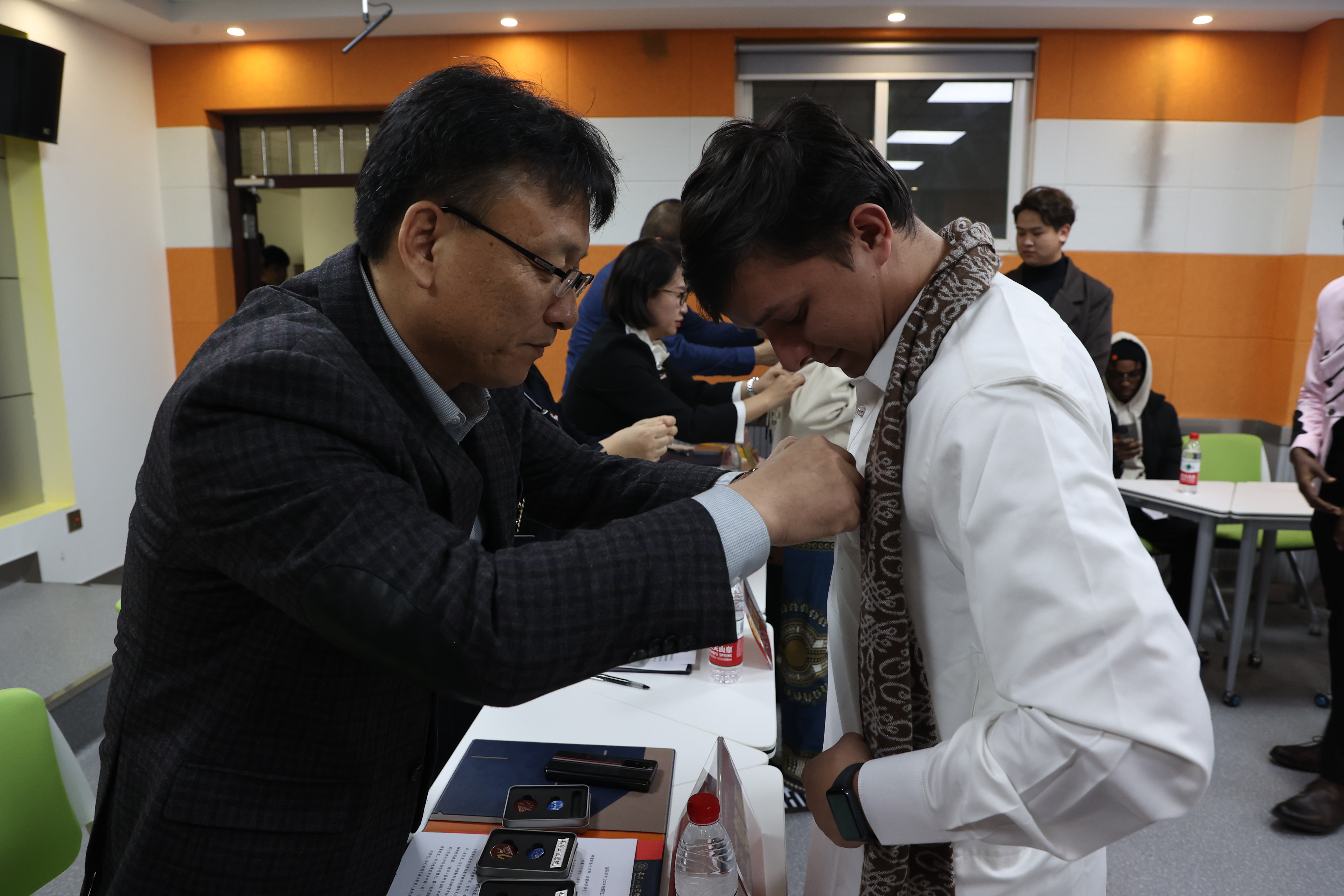 典礼上,各位领导和老师为新生们佩戴了校徽。