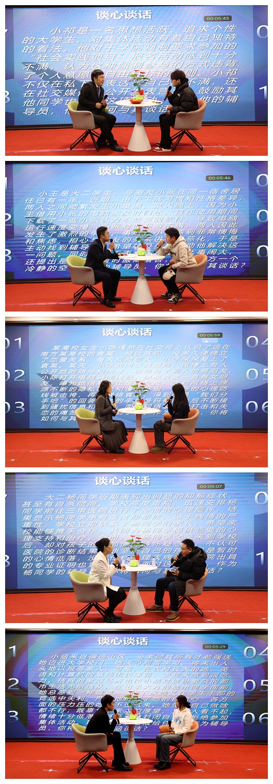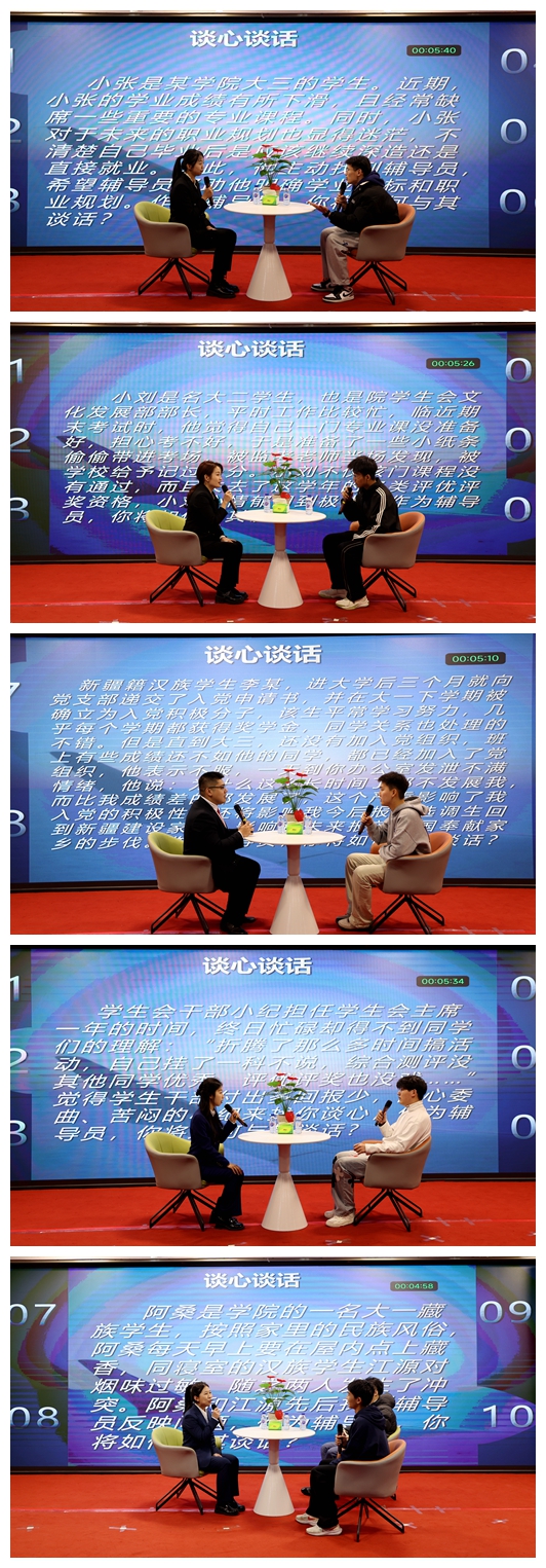 决赛设置了看图识人和谈心谈话两个环节。在看图识人环节,大屏幕上随机显示参赛选手所带班级的6名学生照片,要求选手在3分钟内辨认并描述出该学生的姓名、班级、民族、政治面貌、籍贯等信息,辅导员在此环节充分展现了自己的认知能力和记忆力,赢得了现场的阵阵掌声;在谈心谈话环节,参赛辅导员们面对模拟的学生问题情景,展现出扎实的专业知识和丰富的实践经验,通过耐心沟通、循循善诱、精准施策,帮助同学们解决学业压力、人际关系、心理调适、职业规划等问题,展现了辅导员们对学生个性特点的深入了解、对学生成长成才规律的精准把握、对学生工作的满腔热忱。