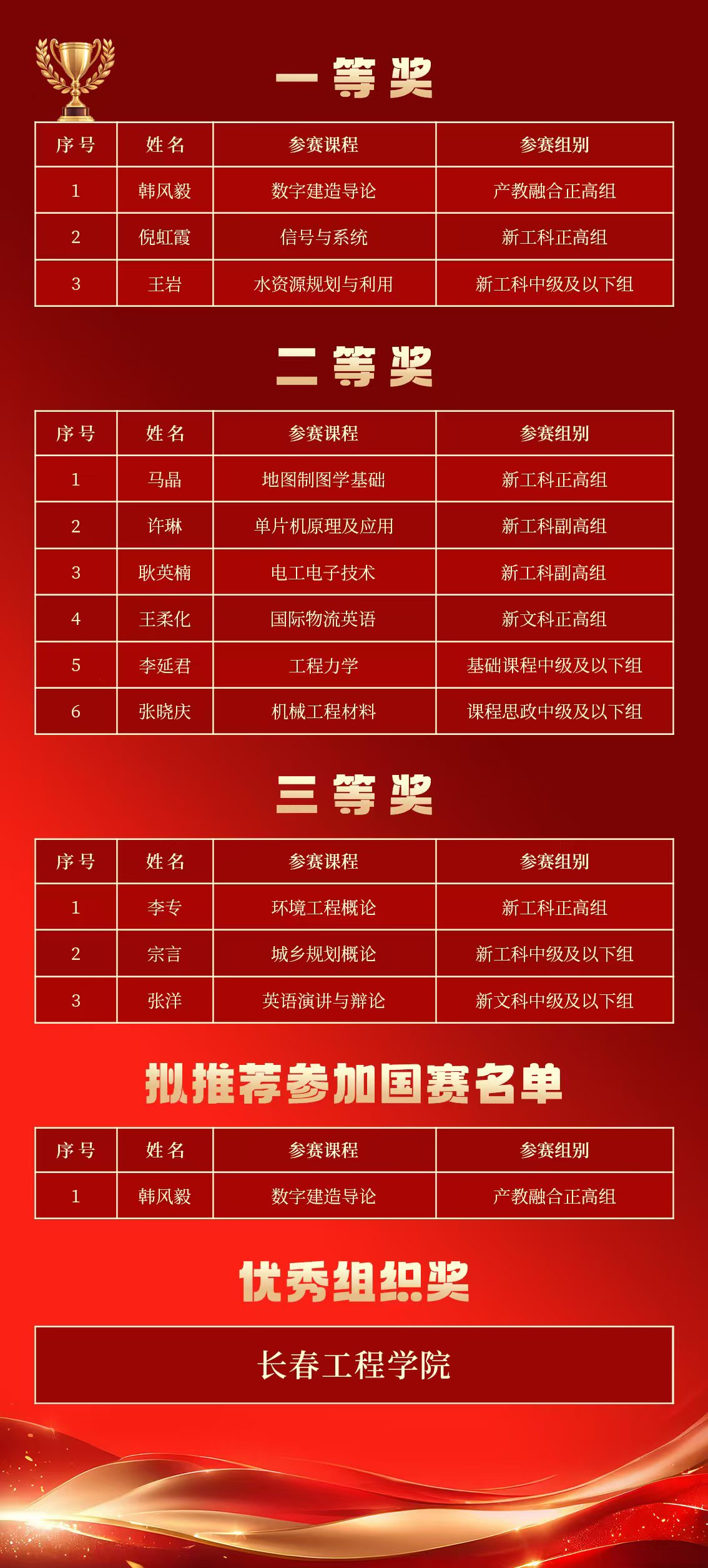 本届大赛由吉林省教育厅主办,以“推动教学创新 培养一流人才”为主题,旨在以建设高质量教育体系为目标,深入推动高等教育教学改革,共设有新工科、新医科、新农科、新文科、基础课程、课程思政、产教融合7个赛道。经过激烈角逐与层层筛选,吉林省80名教师(团队)获一等奖、132名教师(团队)获二等奖、208名教师(团队)获三等奖,12所高校获优秀组织奖。