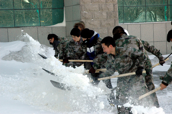 日前,长春迎来了今年最大规模暴雪。为方便师生出行,提前返校进入恢复性训练的我校国防生于2月27日和3月2日,在乐鱼官网网页版_乐鱼(中国)官方校园服务中心的大力支持下,于雪后第一时间展开校园“破冰除雪”大行动。我校湖西校区170余名国防生不畏严寒,持续作业,累计7个多小时,分别对第七教学楼、第三教学楼周围“死角”和学生一公寓门前的道路及附近的积雪进行了重点清除,极大方便了师生的出行。新时期“雷锋精神”在我校国防生身上得到了很好的诠释。