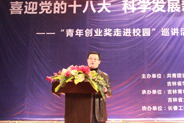 为了迎接党的十八大召开,激励在校大学生积极创业,11月14日14时,“喜迎党的十八大科学发展新成就”青年创业奖走进校园巡讲活动在我校湖西校区大学生活动中心隆重举行。此次活动由共青团吉林省委乐鱼官网网页版_乐鱼(中国)官方部主办,吉林青年创业园朝阳园区、吉林省大学生创业俱乐部承办,由我校团委协办。我校各学院学生代表1000余人听取了报告。活动由校团委社会实践部部长齐乐主持。