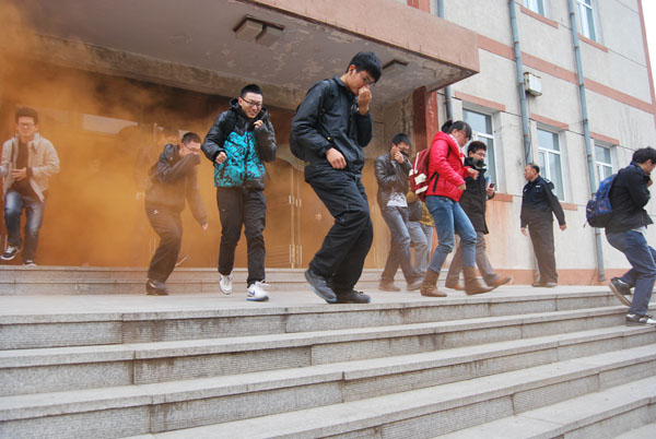 2012年11月5日、6日,分别在我校湖西校区第三教学楼和湖东校区第二教学楼开展紧急疏散逃生演练。紧急疏散逃生演练中,使用了烟雾弹模拟火灾现场,浓烟滚滚,场景逼真,使参与演练的师生身临其境,体验真实。通过演练,增强了师生员工火场的逃生基本技能,提高了师生员工的消防安全意识,达到了预计效果。