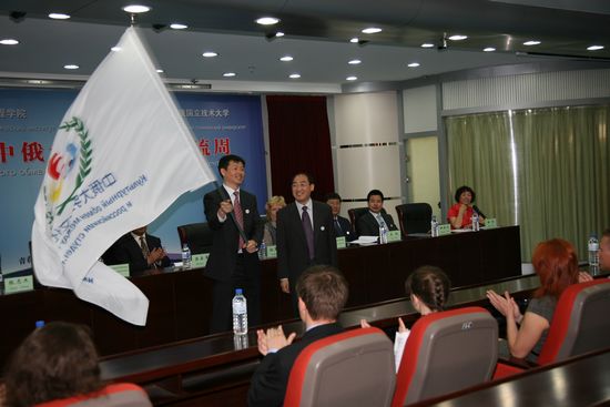 大会首先奏乐鱼官网网页版_乐鱼(中国)官方和南俄国立技术大乐鱼官网网页版_乐鱼(中国)官方歌;主持人回顾了两校十几年来的友好情谊,介绍了双方在校际交流合作上取得的成果;副院长任玉珊向中俄大学生文化交流周活动主办方授予了寓意“青春、友谊、进步”主题的旗帜。