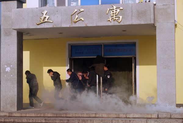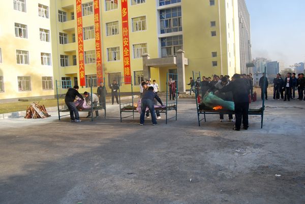 演练共分两个内容,第一项内容是师生进行灭油锅火、灭床铺火、灭煤气罐火、灭油槽火、灭木材火和利用墙壁消防栓灭火六个项目的演练;第二项内容是疏散逃生演练。按照预先设定的模拟剧情,五公寓3楼突然冒出了滚滚浓烟,报警铃声急促响起,火势迅速蔓延,烟雾向四周不断扩散,随时会威胁师生的人身安全。保卫处和学生宿舍管理人员立即拨打119报警电话,并紧急组织疏散宿舍里的学生,校医院医务人员赶到现场对晕倒学生进行抢救。消防车及时赶到,利用缓降器、救生软梯等工具救出被困学生,将“大火”扑灭。楼里千余名学生得到安全疏散,被困人员被安全救出,演练圆满结束。