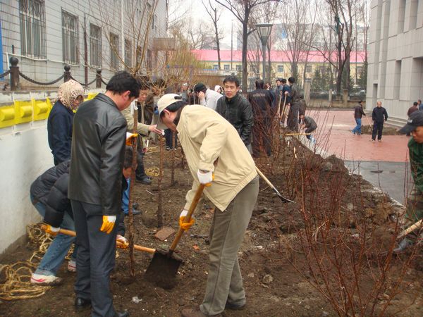 4月22日上午,后勤服务总公司分党委全体党员和党员积极分子,在我校逸夫图书馆北侧栽植“党员林”。这是开展“我为党旗增光彩” 活动以来总公司分党委的又一次大型活动。