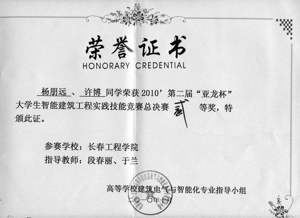 10月23日,我校代表队在北京建筑工程学院举行的第二届“亚龙杯”全国大学生智能建筑工程实践技能竞赛总决赛中排名第四名,获得二等奖。我校代表队由能源动力工程学院建筑电气与智能化专业学生杨朋远和许博参加,段春丽、于兰担任指导教师。