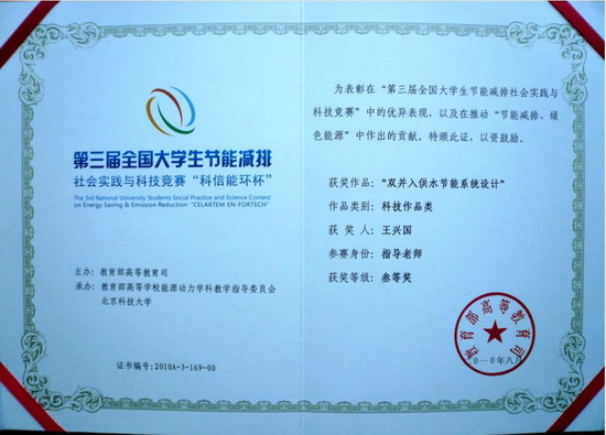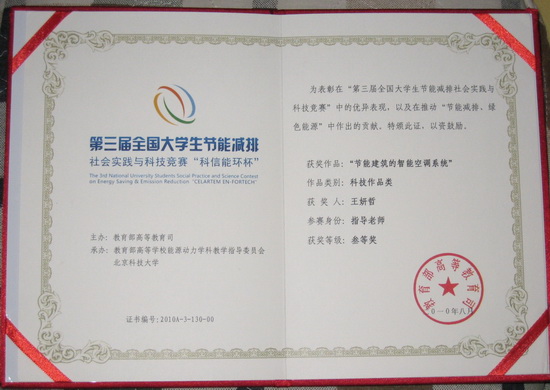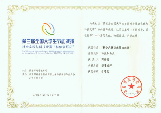 本届竞赛共有包括港澳台地区在内的全国232所高校1868件作品参赛。我校能源动力工程学院和教务处通过共同举办校级预赛,共有四个学院的学生参加预赛,选出12件作品参加全国竞赛。我校能源动力工程学院代表队在该项赛事中表现突出,有3个作品获得科技作品类三等奖。分别为由能源动力学院商福民老师指导,孙洪坤、顾维鹏、刘昕同学共同完成的《耦合式脉动热管换热器》;王兴国老师指导,王博、王瑛、李兆俊、张永光、程道坤同学共同完成的《双并入供水节能系统设计》;王妍哲老师指导,陈晓伟、唐仁轩、姜霞、张永伟、钱苗叶同学共同完成的《节能建筑的智能空调系统》。