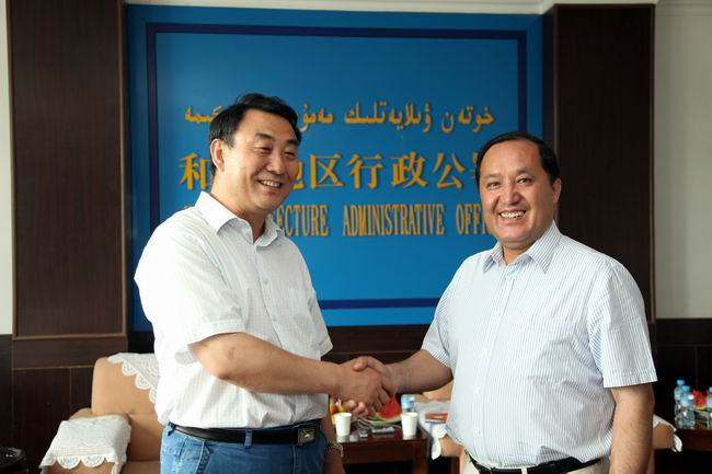 校长韩立强与新疆和田地区行政公署专员巨爱提·伊明校友亲切握手