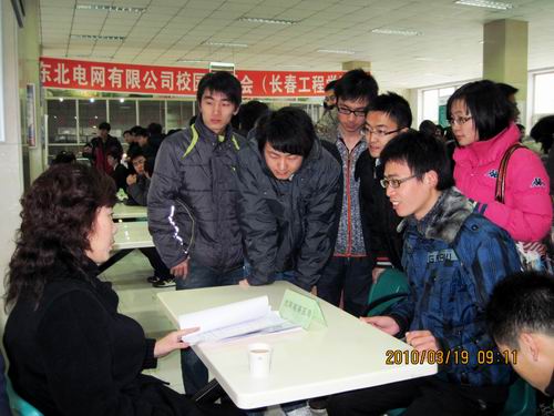 3月19日,东北电网有限公司来我校举办了2010届毕业生专场招聘会。上午9时,沈阳超高压局、锦州超高压局、长春超高压局、哈尔滨超高压局、白山发电厂、丰满发电厂等12家单位在我校院本部食堂拉开了招聘序幕,提供30多个工作岗位。在招聘会现场,我校学生与招聘单位认真交谈,详细询问企业的各种情况,近20名学生当场与企业签订了就业协议。
