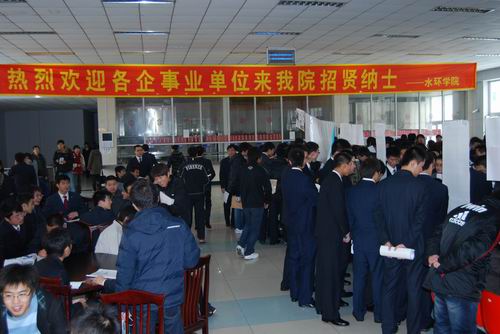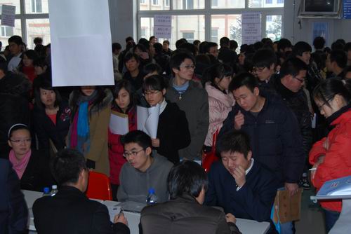 11月14日,我校2010届毕业生“双向选择”洽谈会在校本部食堂和图书馆两个场地同时举行,洽谈会为期一天。虽然当天天空飘着雪花,但毕业生们求职热情高涨,早早的就排起长队等候入场。