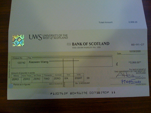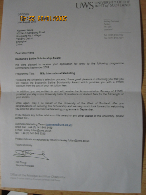 王啸雯同学在西苏格兰大学学习近两个月的时间里,通过刻苦努力,以优异的成绩完成了第一阶段的学习任务。9月末,她在与该校众多国际学生的评比中脱颖而出,获得该校唯一一项由英国苏格兰议会教育办公室授予的苏格兰圣安德鲁十字奖学金(2000英镑)。