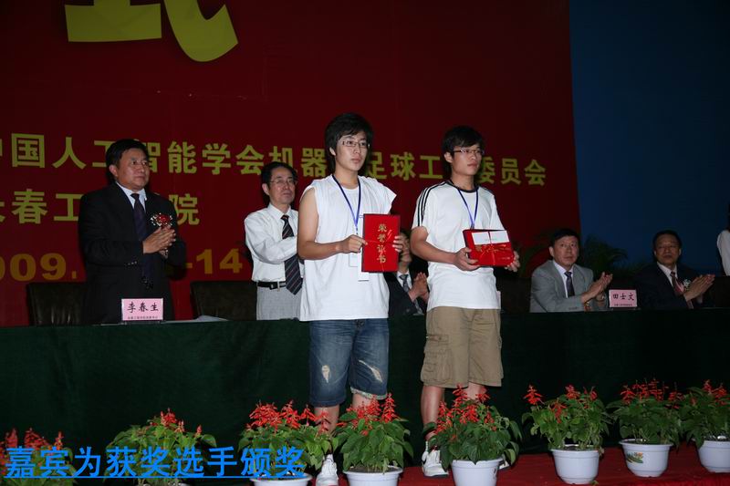 在为期三天的比赛中,全体参赛队员在领队、教练的指导下,刻苦钻研,努力拼搏,以人机最佳状态投入到各项比赛中,取得了优异成绩。大赛裁判长、哈尔滨工业大学朴松昊公布了比赛成绩。我校参赛队在类人型机器人娱乐类比赛中获得4人舞蹈、拳击两项桂冠;获得8人舞蹈、击剑两项亚军;获得类人型机器人投篮比赛季军。其他奖项被哈尔滨工业大学等参赛队获得。我校苑全德和哈尔滨工业大学等六人被评为最佳裁判员。我校代表队被大赛组委会授予创新奖荣誉称号。与会领导伴随着悠扬的乐曲为获奖队员颁奖。