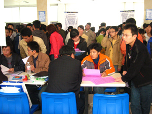 下午1点30分,在有色金属工业人才中心负责人的带领下,12家有色系统单位在我校院本部食堂拉开了招聘序幕。在三个多小时的招聘活动中,我校各院(系)共2000多名同学到现场应聘。截至下午5点,近100名毕业生现场签约。