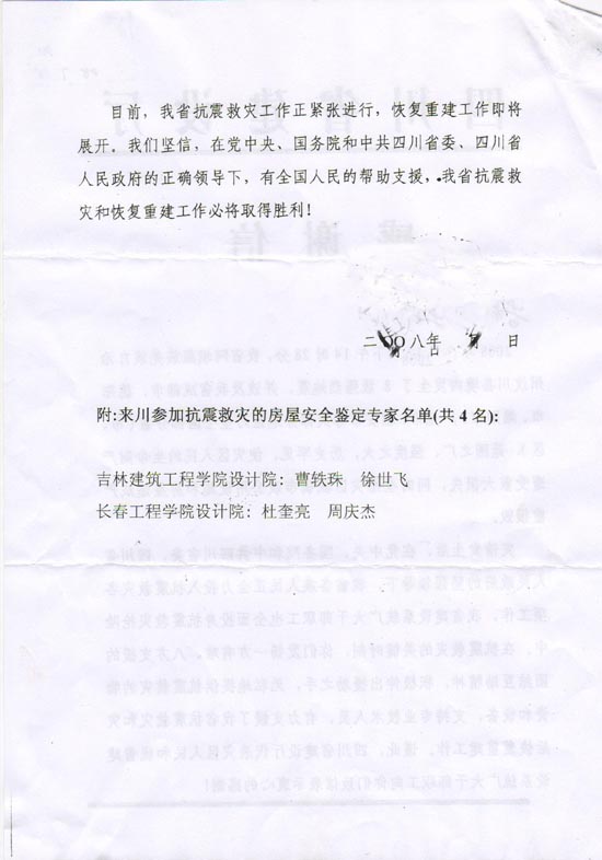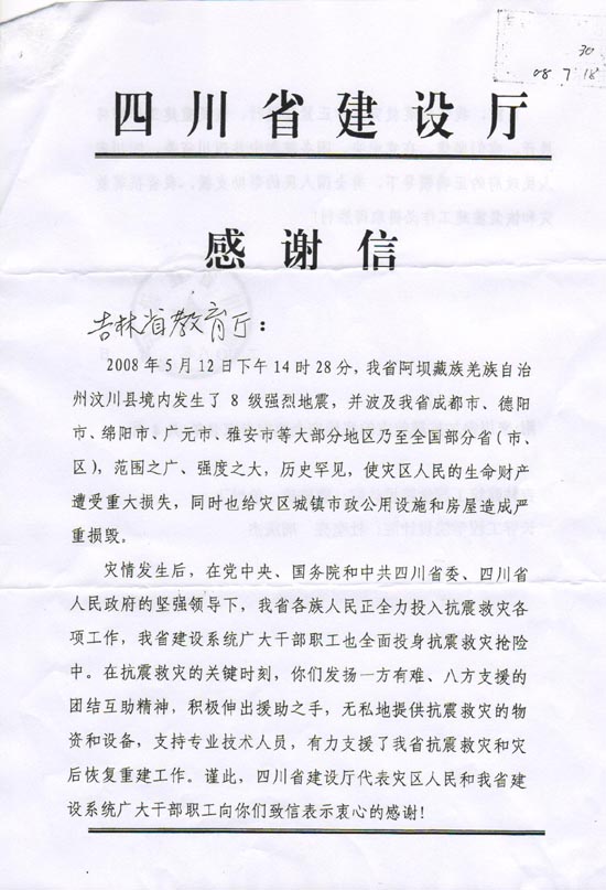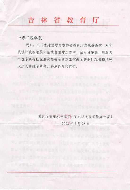 近日,四川省建设厅向吉林省教育厅发来了感谢信,对我校选派专家抗震救灾表示感谢,吉林省教育厅将感谢信转发我校。
