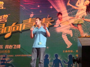 在持续两个多小时的比赛中,32名选手依次登台献艺。台上曲曲精彩,令人陶醉神往,扑面而来的青春活力将现场气氛一次次推向了高潮。台下的同学们热情地挥舞着手中的彩旗和绿色的喝彩棒,欢呼声、喝彩声、鼓掌声此起彼伏。我校鲍浩政同学以一曲《我们的歌》秀出了个性声音,秀出了个性自我,深情款款却又激情四射的演唱,赢得了评委的肯定,在32名选手中成功晋级七分之一。
