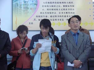 然后学生代表讲话,他表示要好好珍惜图书,养成良好的阅读习惯。