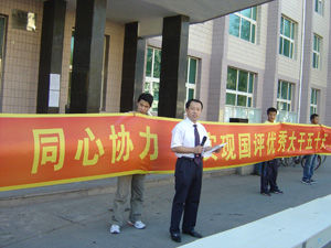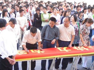 最后,机电学院全体师生员工在条幅上郑重的签上了自己的名字,表示要以强烈的责任感、高度的热情、振奋的精神、严明的纪律展示机电学院师生员工的优良素质和形象。
