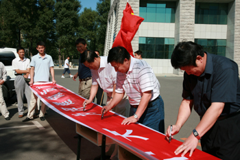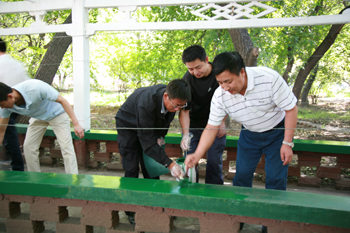一总支全体党员在“大干五十天,我为评建做贡献”条幅上签字拉开了主题活动的序幕。签字仪式后,党员们穿上了预先准备好的工作服,只见有的拿笤帚,有的拿拖布,有的拿砂纸,有的拿油刷,有的调油漆……一时间花园内人头攒动,清扫、擦灰、刷油等有序地开展起来。有经验的老同志给年轻人做示范,一招一式颇有“油匠”的水准。经过两个半小时的劳动,蜘蛛网、垃圾不见了,原来经风吹雨淋、略显斑驳的百米长廊被粉饰一新。党员们看到花园经自己的侍弄变得更美丽了、更洁净了,个个脸上都露出了会心的笑容。