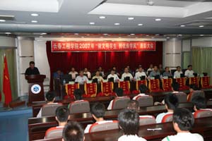 6月28日下午二点,我院在七教13楼会议室隆重举行了2007年“做文明大学生,创优良学风”表彰大会。院党委书记李春生、院长石曙光、副院长韩立强、纪委书记王时刚、副院长任玉珊、司元英、党委副书记吴占军、关工委主任赵学印、学生工作处处长池顺勇、就业指导中心主任兼学生工作处副处长杨树国以及各院系党总支副书记出席大会并在主席台就坐。学生工作处副处长李金明主持大会。
