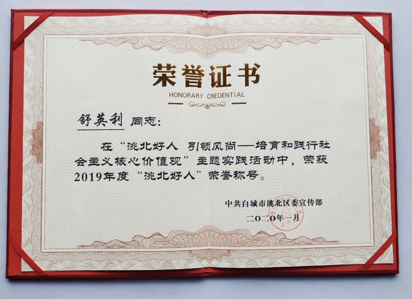 近日,在白城市洮北区委宣传部开展的“洮北好人 引领风尚——培育和践行社会主义核心价值观”活动中,我校舒英利同志荣获2019年度“洮北好人”荣誉称号。