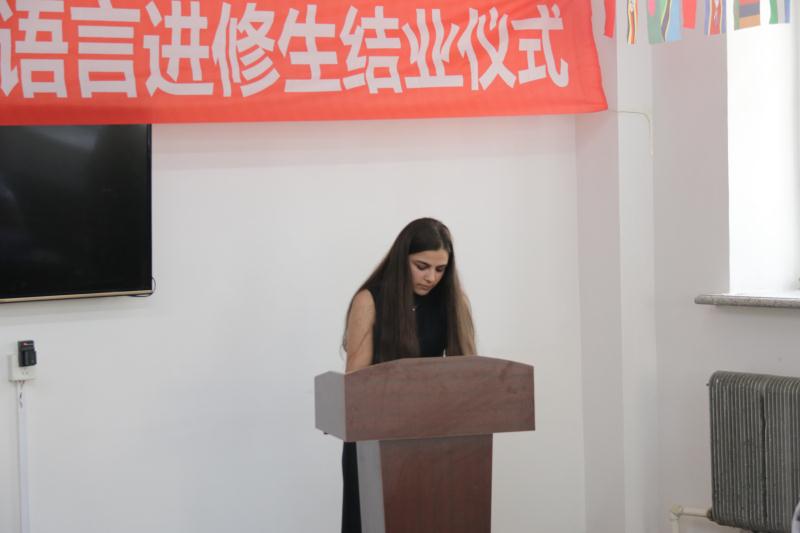 学院对外汉语教学中心主任张冬梅作为教师代表发言,她希望2020届汉语言进修班的国际学生在今后的学习和生活中能够继续坚持汉语学习,更多地了解中国语言和中国文化,为中国与哈萨克斯坦、塔吉克斯坦、泰国和俄罗斯等国人民的友谊和发展做出贡献。